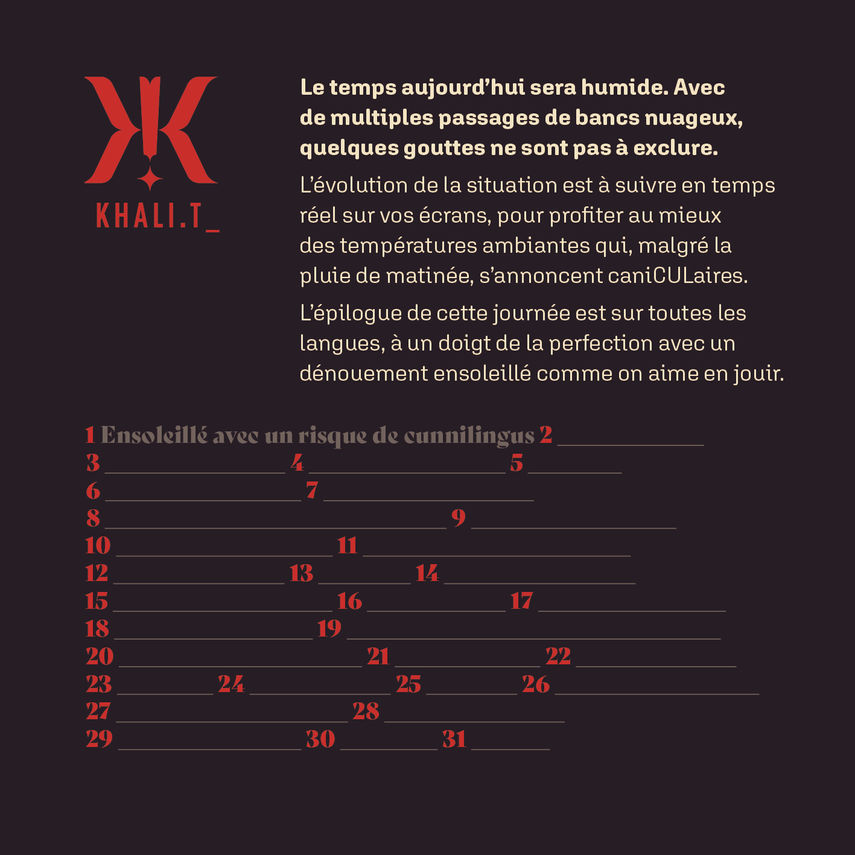 1 - 31 Ensoleillé avec un risque de cunnilingus